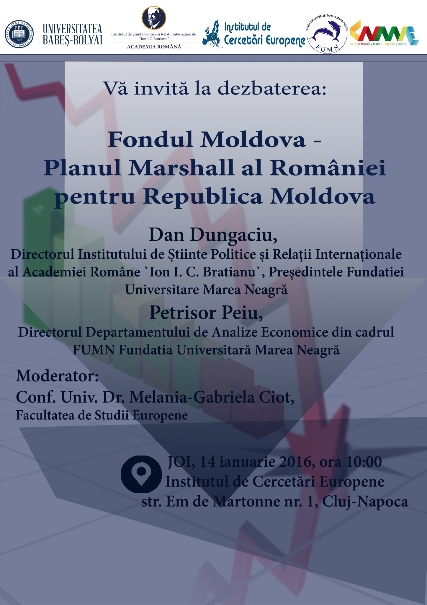 Facultatea de Studii Europene din cadrul Universităţii Babeş-Bolyai împreună cu Institutul de Ştiinţe Politice şi Relaţii Internaţionale ,,Ion I.C.Brătianu”, Institutul de Cercetări Europene (ICE), Fundaţia Universitară a Mării Negre, Centrul pentru Negocieri şi Medieri Internaţionale şi Europene (CNMIE), organizează joi, 14 ianuarie 2016, dezbaterea cu titlul ,, Fondul Moldova- Planul Marshall al României pentru Republica Moldova“.