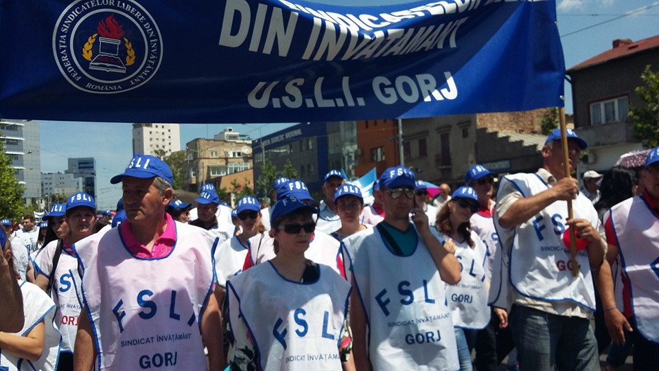 Câteva mii de sindicaliști din toată țara, alături de elevi și părinți, au pornit în jurul prânzului din Piața Victoriei într-un marș către Palatul Cotroceni, protestul fiind generat de eșuarea negocierilor cu Guvernul României referitoare la salarizarea din învățământ.Protestatarii au afișat pancarte cu mesaje: „Vrem să fim tratați corect, cu cinste și cu respect!”, „Afară, afară cu politica din școală”, „Fără educație moare orice nație”, „Muncă decentă, salarii indecente”, „Guvernul a decis: învățământul va fi ucis”. De asemenea, protestatarii au scandat: „Trădătorii”, „Vrem o țară ca afară”, „Demisia”, „Jos cu trădătorii”, „Vrem respect”, „Jos Guvernul”. Din Gorj au participat circa 100 de sindicaliști afiliați FSLI.