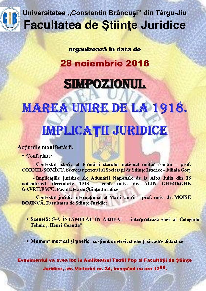 Potrivit domnului Alin Gheorghe Gavrilescu, din partea instituției organizatoare, manifestarea se va desfășura în data de 28 noiembrie 2016 în amfiteatrul ”Teofil Pop” al Facultății de Științe Juridice din Târgu-Jiu. Din program reținem conferințele:” Contextul istoric al formării statului naţional unitar român ”– prof. CORNEL ŞOMÎCU, Secretar general al Societăţii de Ştiinţe Istorice – Filiala Gorj; ” Implicaţiile juridice ale Adunării Naţionale de la Alba Iulia din 18 noiembrie/1 decembrie 1918” – conf. univ. dr. ALIN GHEORGHE GAVRILESCU, Facultatea de Științe Juridice; ” Contextul juridic internațional al Marii Unirii ”– prof. univ. dr. MOISE BOJINCĂ, Facultatea de Științe Juridice. Manifestările mai cuprind o scenetă interpretată de elevii Colegiului Tehnic ”Henri Coandă” intitulată ”S-a întâmplat în Ardeal” dar și un moment muzical şi poetic – susţinut de elevi, studenţi şi cadre didactice.