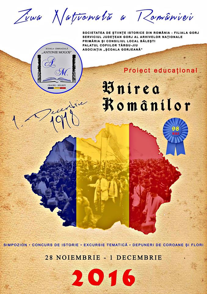 Ca în fiecare an, Școala Gimnazială ”Antonie Mogoș” Ceauru-Bălești a organizat în aceste zile un proiect educațional județean dedicat Zilei Naționale. Intitulat ”UNIREA ROMÂNILOR”, proiectul educațional a atras participarea a peste 300 de elevi și 20 de cadre didactice. Manifestarea a fost organizată în parteneriat cu Societatea de Științe Istorice Gorj, Serviciul Județean Gorj al Arhivelor Naționale, Primăria și Consiliul Local Bălești, Palatul Copiilor Târgu-Jiu și Asociația ȘCOALA GORJEANĂ.