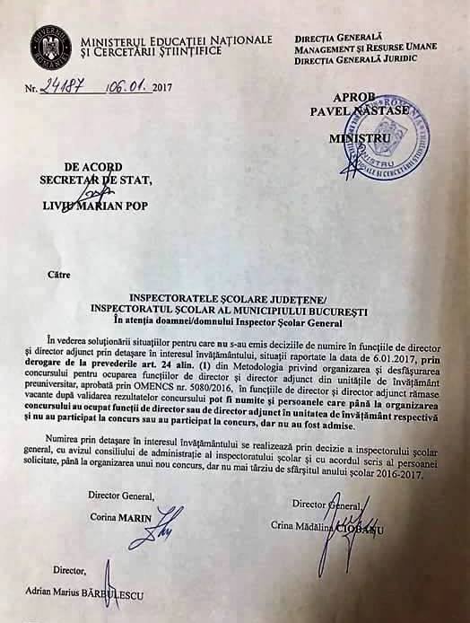 Redăm mai jos conținutul adresei nr 24 187 din 6 ianuarie 2017 a Ministerului Educației:”În vederea soluţionării situaţiilor pentru care nu s-au emis deciziile de numire în funcţiile de director și director adjunct prin detaşare în interesul învăţământului, situaţii raportate la data de 6.01.2017, prin derogare de la prevederile art. 24 alin. (1) din Metodologia privind organizarea şi desfăşurarea concursului pentru ocuparea funcţiilor de director şi director adjunct din unităţile de învăţământ preuniversitar, aprobată prin OMENCS nr. 5080/2016, în funcţiile de director şi director adjunct rămase vacante după validarea rezultatelor concursului pot fi numite şi persoanele care până la organizarea concursului au ocupat funcţii de director sau de director adjunct în unitatea de învăţământ respectivă şi nu au participat la concurs sau au participat la concurs, dar nu au fost admise.