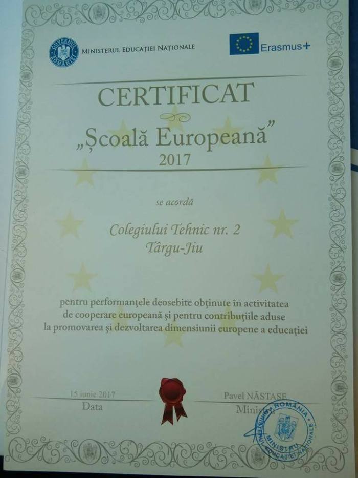 O încununare a muncii depuse, care astăzi ne motivează pentru a continua drumul cu aceeași dorință și motivație, este dobândirea pentru a patra oară consecutiv de către COLEGIULUL TEHNIC NR. 2 TG-JIU a prețiosului trofeu ȘCOALĂ EUROPEANĂ.