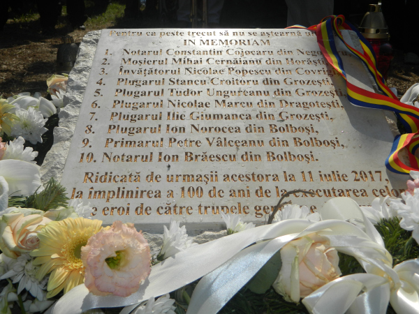 Pe placa memorială dezvelită marți, 11 iulie 2017, sunt inscripționate pentru veșnică pomenire numele celor zece martiri, așa cum au fost ei menționați într-o consemnare istorică, pe care o redăm: „Comandatura de Etapă 22, Turnu Severin la 11 iulie 1917. Încunoștințare: Prin sentința Consiliului de Război a Comandaturei de Etapă Nr. 22 din 8 iulie 1917, au fost osândiți la moarte pentru trădare în timp de război: 1. Notarul Constantin Cojocaru din Negomiru, 2. Moșierul Mihai Cernăianu din Horăști, 3. Învățătorul Nicolae Popescu din Covrigi, 4. Plugarul Stancu Croitoru din Grozești, 5. Plugarul Tudor Ungureanu din Grozești, 6. Plugarul Nicolae Marcu din Dragotești, 7. Plugarul Ilie Giumanca din Grozești, 8. Plugarul Ion Norocea din Bolboși, 9. Primarul Petre Vâlceanu din Bolboși, 10. Notarul Ion Brăescu din Bolboși. Această sentință a fost confirmată de Dl. Comandant pe ziua de 10 iulie 1917, sentința a fost astăzi executată (SS) Von Kusenberg”.