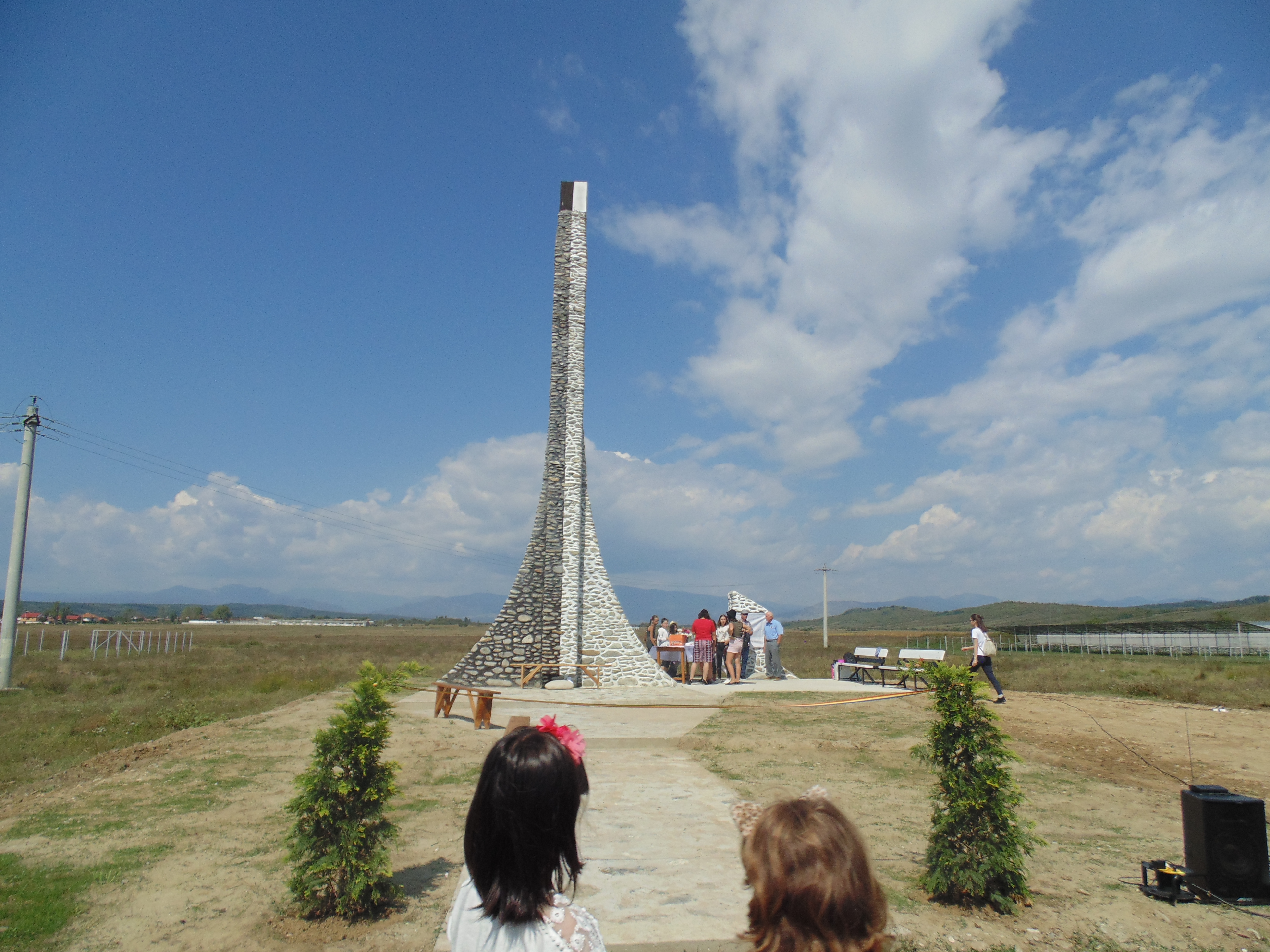 La ora 13, a avut loc inaugurarea şi sfinţirea operei plurivalente „Strigătul” ridicată prin strădania prof. Ion Mălăescu, fiu al comunei, profesor de limba engleză şi artist plastic, lângă Fântâna lui Coşbuc. . În deschidere, un grup de eleve de la Şcoala Gimnazială nr. 1 din Rovinari, grup instruit şi condus de înv. Ramona Sorlea (fiica autorului) a prezentat un buchet de piese folk interpretate vocal cu acompaniament de chitări. „Privită din faţă, ea este un obelisc, Privită dinspre răsărit, ea este o lebădă, privită dinspre apus, e un corb, iar privită din cer este o cruce. Ea poate să amintească privitorului de Turnul Eifel, de Coloana Infinită, de Pasărea Măiastră, de turla unei biserici maramureşene,… Are 12 metri înălţime (număr ales deloc întâmplător), are o siluetă graţioasă şi o simetrie care impresionează prin echilibru, deşi materialul folosit e piatra de râu neşlefuită. Reprezintă partea superioară a unei păsări al cărui corp este însuşi globul pământesc şi care ne găzduieşte şi ne ocroteşte sub aripile sale într-un zbor infinit şi sigur prin univers. Ne cere o singură plată: în interesul nostru, să încercăm să fim azi mai buni decât ieri…” – a spus autorul prezentându-şi opera. Toate aceste idei şi multe altele se găsesc în cartea „Să fim mai buni!”, apel la dialog şi normalitate, carte scrisă de autor, tehnoredactare Ramona Sorlea şi distribuită gratuit participanţilor la inaugurare.