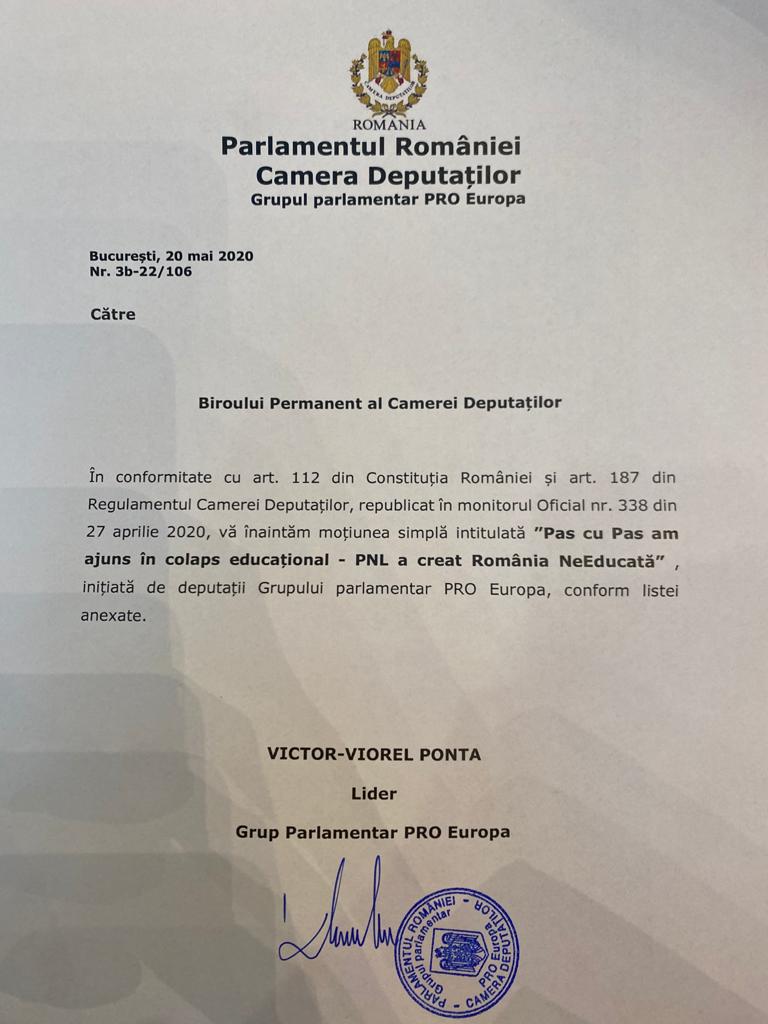 PRO România și PSD au depus miercuri, 20 mai 2020, o moțiune simplă îndreptată împotriva ministrului Educației, Monica Anisie. Titlul documentului este ”Pas cu pas am ajuns în colaps educațional – PNL a creat România NeEducată”. Documentul a fost depus la Parlament de Victor Ponta, șeful Pro România. Interpretând Constituția într-un mod ”original”, miniștrii Guvernului Orban care au pierdut votul până acum nu au plecat din funcții.