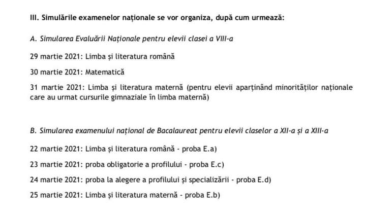 Simularea examenului de Bacalaureat pentru elevii claselor a XII-a se va desfășura în perioada 22-25 martie, iar simularea Evaluării Naționale pentru elevii clasei a VIII-a este programată în perioada 29-31 martie 2021.. “Pentru pregătirea examenelor naționale (Evaluare Naţională 2021 și Bacalaureat 2021) vor fi publicate pe site-ul CNPEE, începând cu data de 22 februarie 2021, teste de antrenament”, a mai anunțat Ministerul Educației.