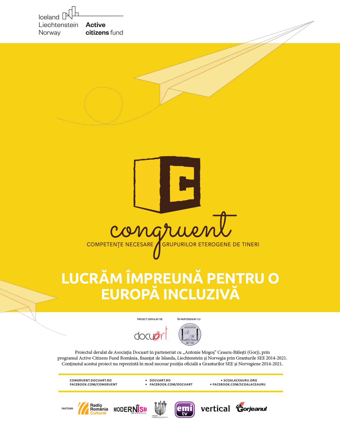 „Proiectul este derulat de Asociația Docuart în parteneriat cu Școala Gimnazială „Antonie Mogoș” cu sprijin financiar Active Citizens Fund România, program finanțat de Islanda, Liechtenstein și Norvegia prin Granturile SEE 2014-2021. Scopul proiectului este creșterea capacității grupurilor inter-etnice vulnerabile de copii și de adulți din comunitatea defavorizată pe o perioadă de 20 luni prin măsuri de incluziune, educație non-formală, parenting, mentorat, combatere bullying, dezvoltare economică prin workshop-uri și cursuri acreditate în antreprenoriat, consultanță în elaborare planuri de afaceri, activare Grup de Inițiativă Locală, derulare de campanii de conștientizare și realizare de propuneri către autoritățile publice locale.