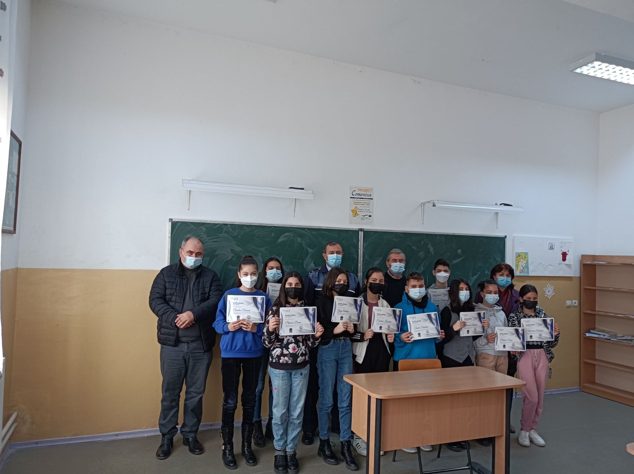 Instituțiile partenere din cadrul proiectului au desemnat ca fiind câștigătoare, Școala Gimnazială ,,Constantin Săvoiu”, din municipiul Târgu-Jiu, urmând ca materialele elaborate de elevii acestei instituții de învățământ să fie înscrise și să participe la etapa națională, al cărei câștigător va fi desemnat la data de 25 martie 2022, cu ocazia Zilei Poliției Române.
